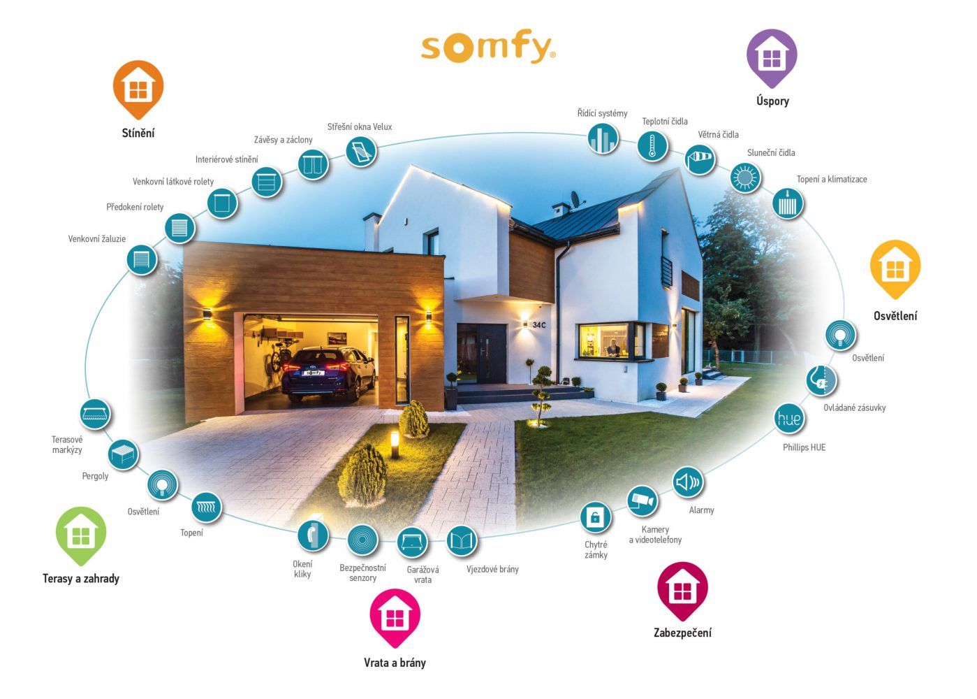 Rádi bychom Vám představili profesionála mezi chytrými domácnostmi. Představujeme Vám SOMFY. Chytrá domácnost SOMFY Vám zjednoduší život. Vstupte do futuristického světa pokročilých technologií, které Vám pomohou se zvládáním rutinních potřeb okolo domu a zjednoduší péči o domácnost. Poznejte pocit bezpečí i při opuštění domova a pocit kontroly svého obydlí na dálku. Zajisté znáte, když jedete do práce a místo věnování se řízení přemýšlíte jestli jste doma zhasli světlo. A proto je tu SOMFY. Naše systémy automatizace domácnosti si poradí s dálkovým ovládáním stínění, osvětlení, pohonem garážových vrat i vjezdových brán. Chytrá domácnost SOMFY zajišťuje bezpečí Vašeho domova.